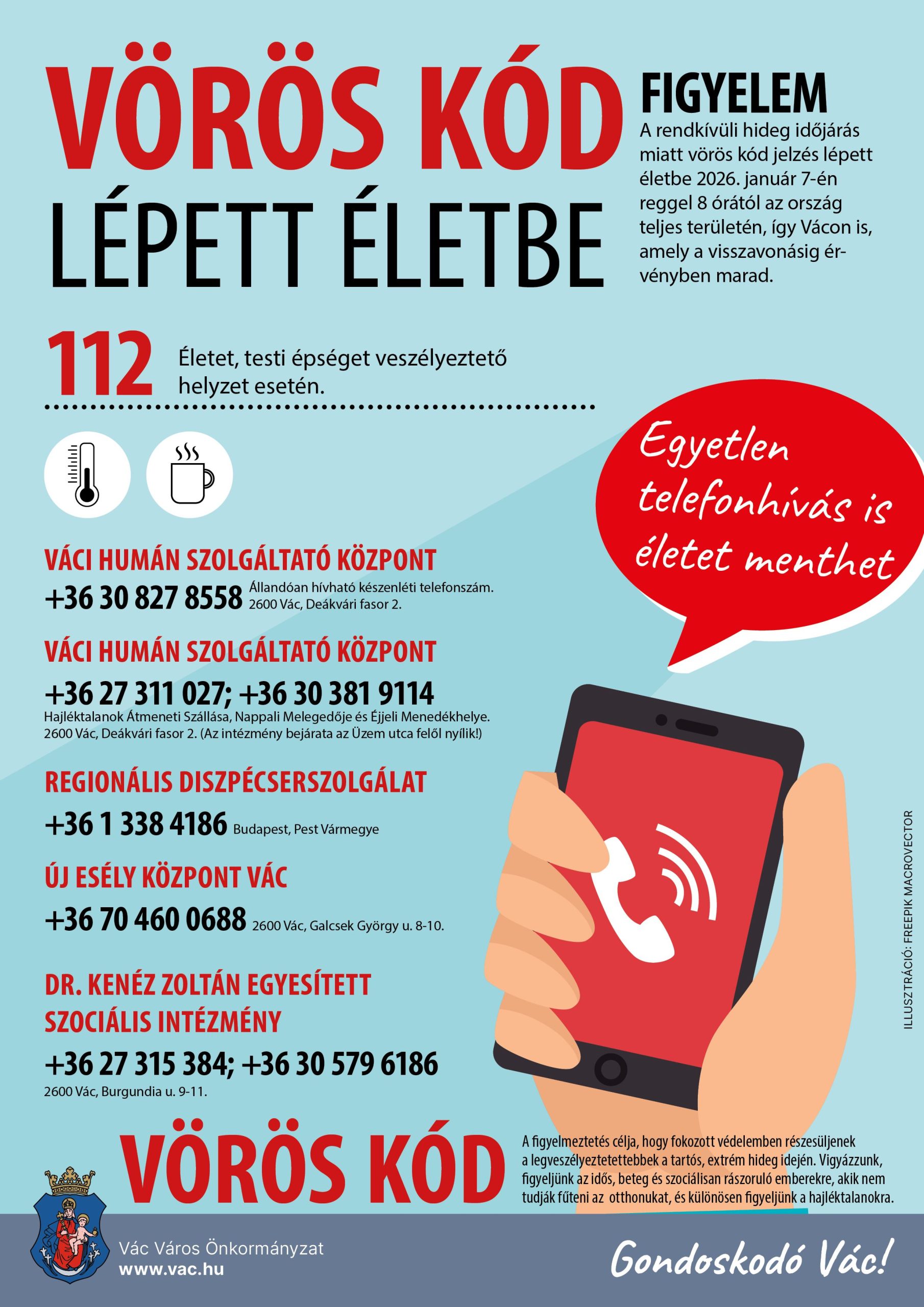 A rendkívüli hideg időjárás miatt vörös kód jelzés lépett életbe 2026. január 7-én reggel 8 órától az ország teljes területén, így Vácon is, amely a visszavonásig érvényben marad.
